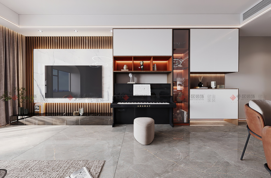 | 設計說明:案例設計風格主體簡潔,以營造低調奢華的居室感受為主。本案軟裝的自由度較高,現代和輕奢的元素融合一起,重在體現溫馨的氛圍、時尚雅致的氣質。所打造的悠閑的生活節(jié)奏,精致高效的生活體驗,開闊的空間氛圍,給業(yè)主以溫馨愜意的幸福感。復古落日橙,溫暖浪漫且溫馨治愈,大面積的低飽和度色彩與明亮色塊的運用形成鮮明對比,完成風格色彩上的呈現。石材與原木給室內帶來自然清新的元素,安靜舒適的氛圍,讓人安靜享受生活。 | |||