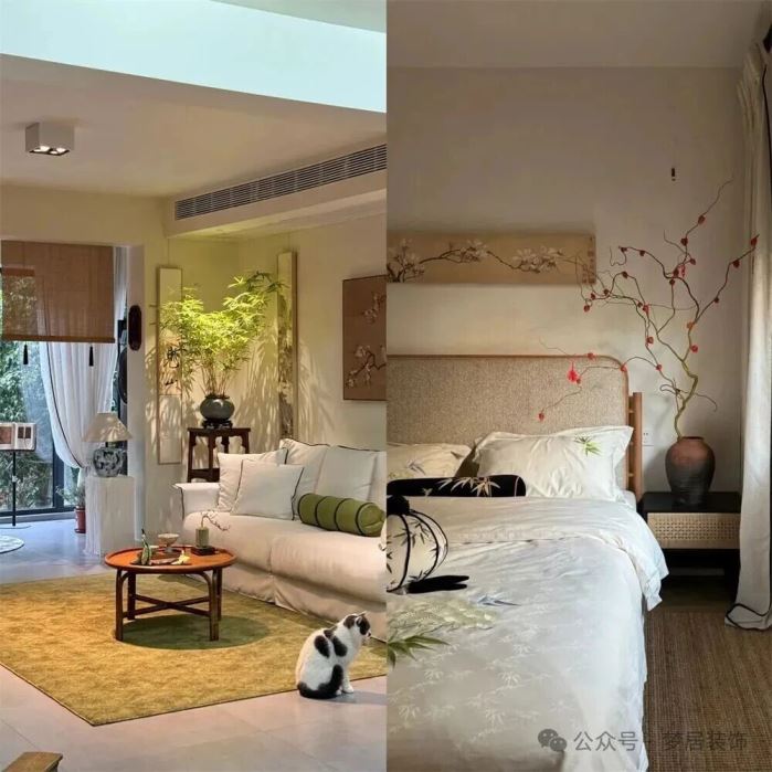 材質(zhì):講究自然肌理和啞光質(zhì)感,多用原木(榆木、白蠟?zāi)荆⑿埣±?、素麻、亞光瓷、?xì)密麻布