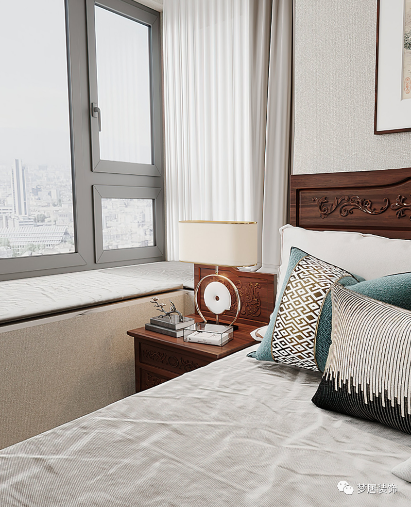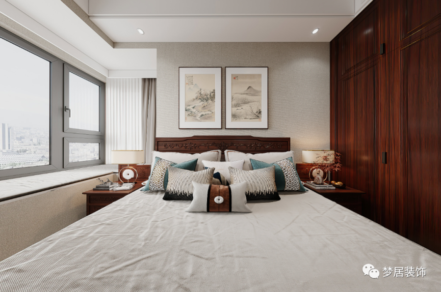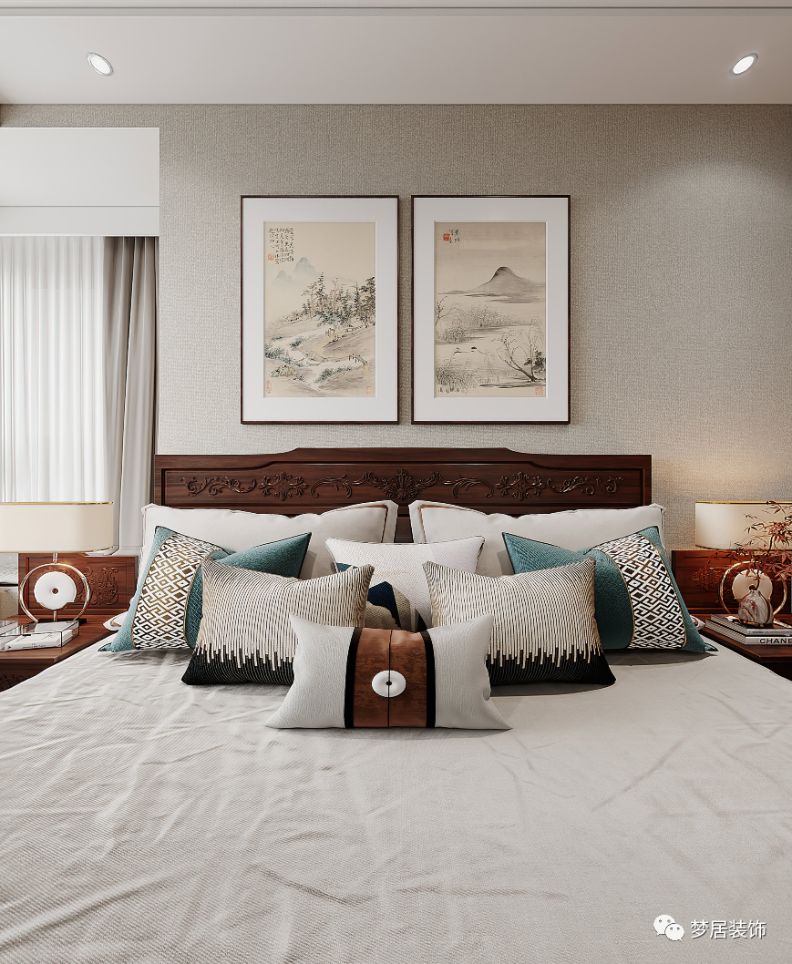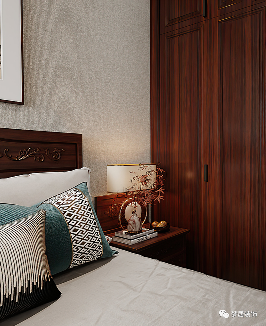 主臥設(shè)計清雅含蓄,典雅內(nèi)斂。