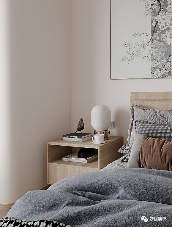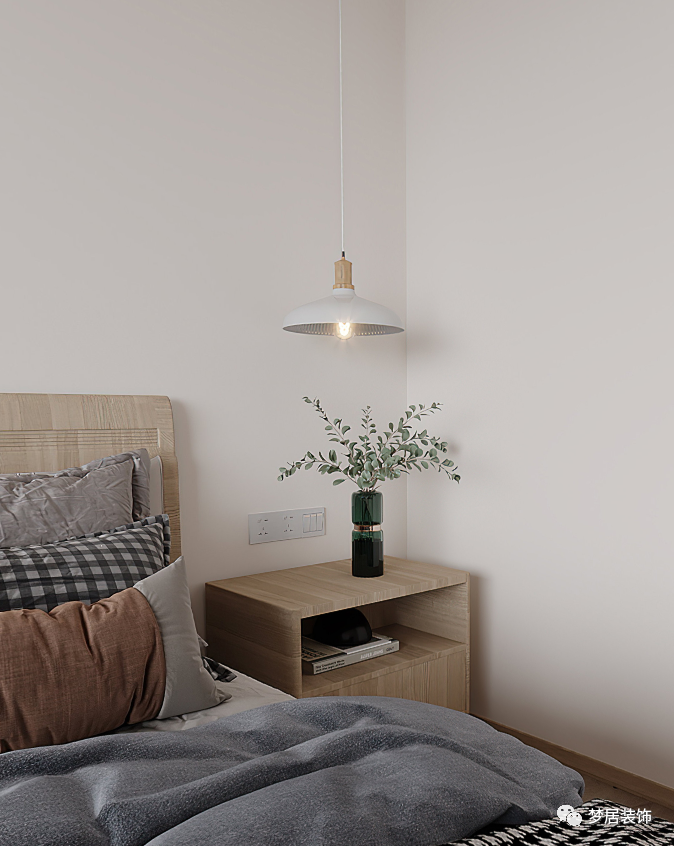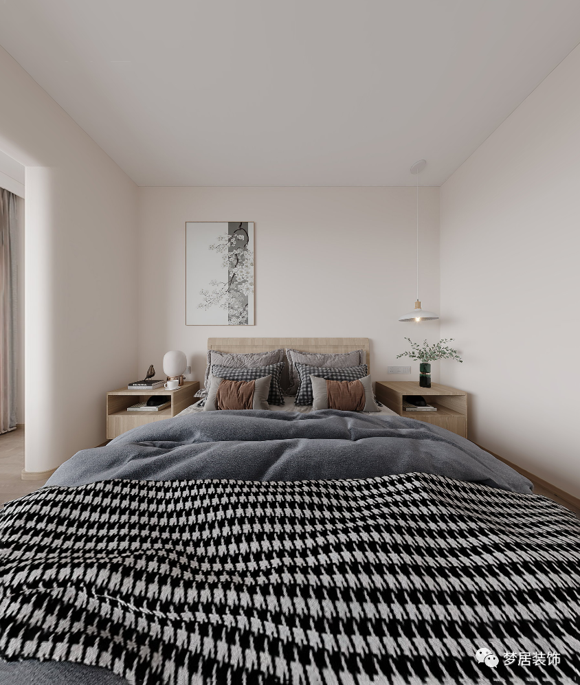 客臥溫馨自然、簡約大方,柔軟的布藝材質(zhì)豐富了整個空間質(zhì)感,極簡的線型吊燈和掛畫也讓整個空間增加了趣味。
