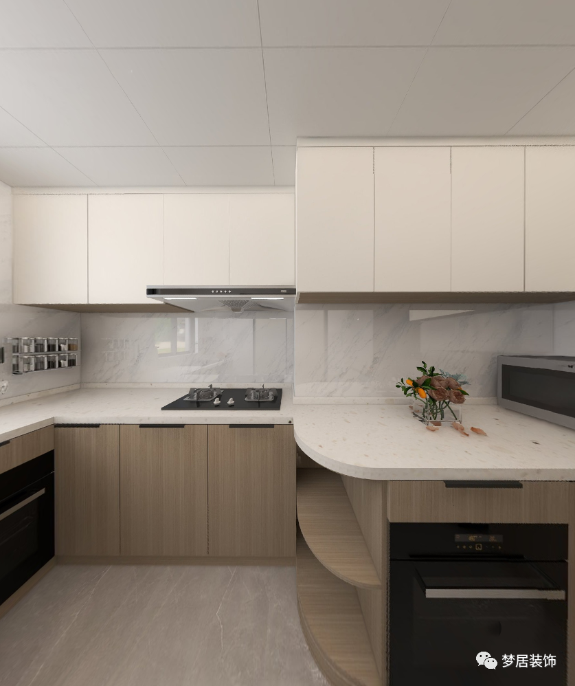 廚房以簡潔的線條分割營造干凈爽朗的空間感,大面積的木色溫潤了空間的的溫度,也提升了空間質(zhì)樸感受。