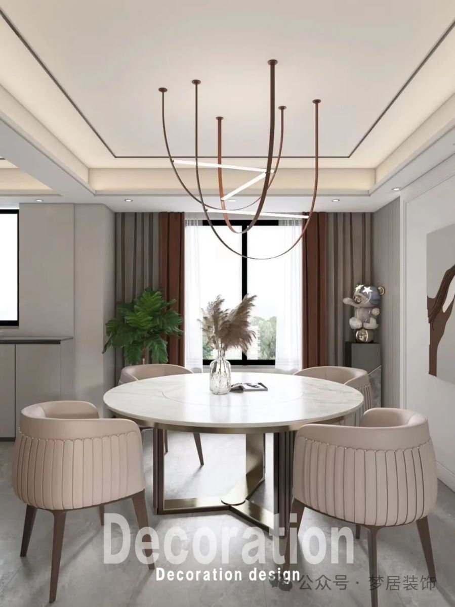 時尚的燈飾裝飾著餐廳,造型線條精致輕奢;圓形的餐桌搭配白色的座椅,簡約又優(yōu)雅。餐廳背景墻上的簡約裝飾畫,更顯得時尚個性;左面做了一個小吧臺。