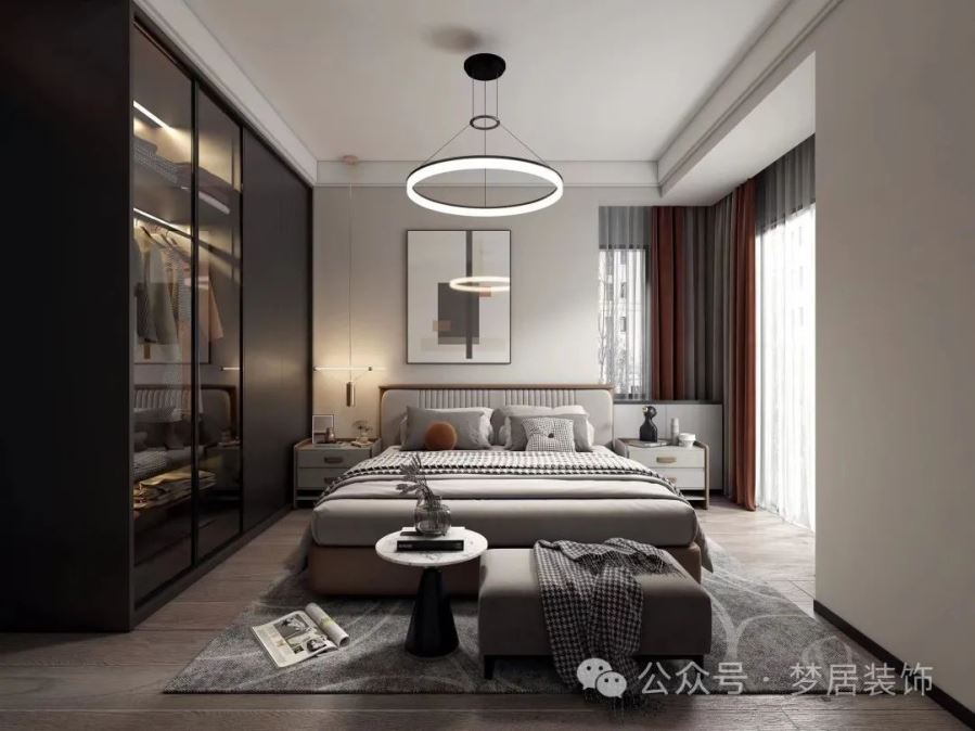 主臥裝修以灰色為基調(diào),搭配木地板,溫馨又有質感?;疑荡钆浜喖s而又高級優(yōu)雅,大落地窗采光舒適,簡約又自在。