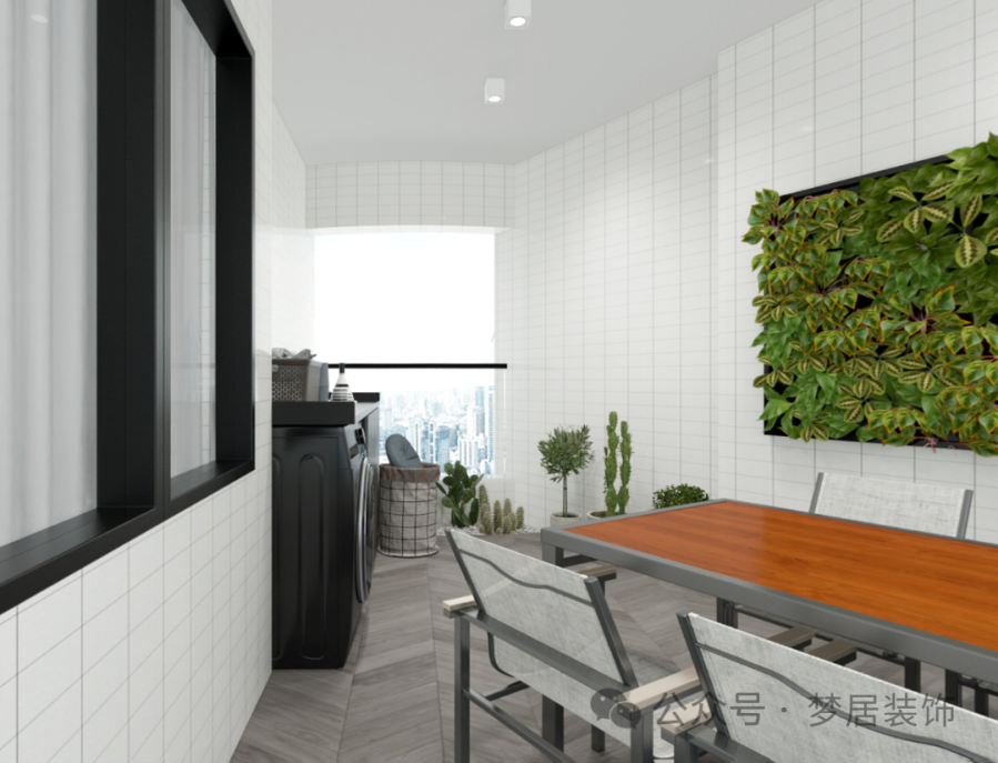 生活陽臺寬敞舒適,玻璃護欄讓空間更通透,擺放上綠植點綴,造型簡約的長桌椅打造出愜意、舒適的感受,給人一種入戶小花園的感覺,偶爾可以和家人或朋友開一個小小的陽臺派對,輕松又美好。