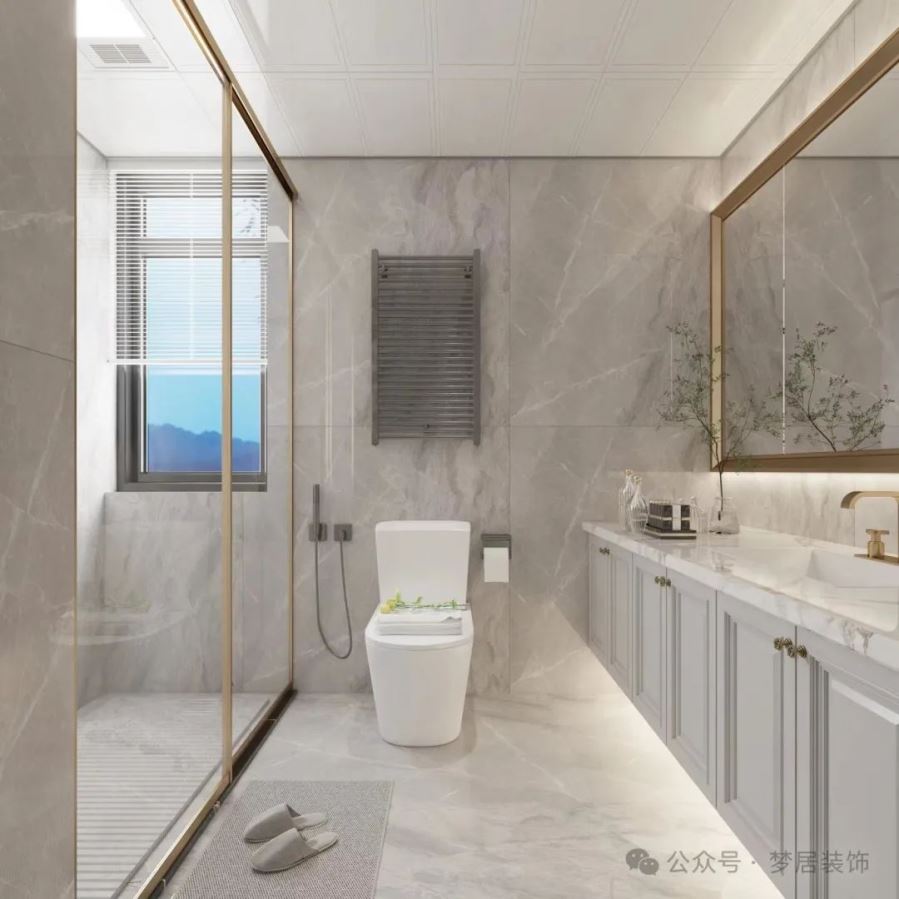 設計師采用拉絲金屬與清玻結合,空間增加隱藏燈光配置,所有配置一應俱全,用陳列的方式構筑舒適奢雅的衛(wèi)浴空間。線條則引入一種有序的理性之感,進而流露出現(xiàn)代輕奢主義中的舒適美學。
