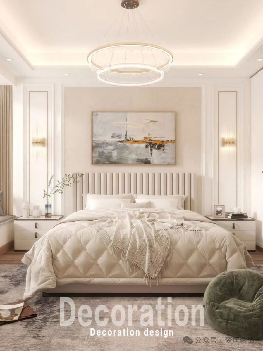 主臥作為私密的個人空間,彰顯居者的品味喜好。設計師以奶白色為肌底,金屬材質裝點其上,予人安謐的視覺享受以及復古摩登氣韻的蔓延,將日常生活情境與審美精神在同一范疇交融,融合紡織品輕奢的纖維質感,進一步增進空間的松弛感,墻面金屬裝飾線條及壁燈彰顯著輕奢奢華質感。