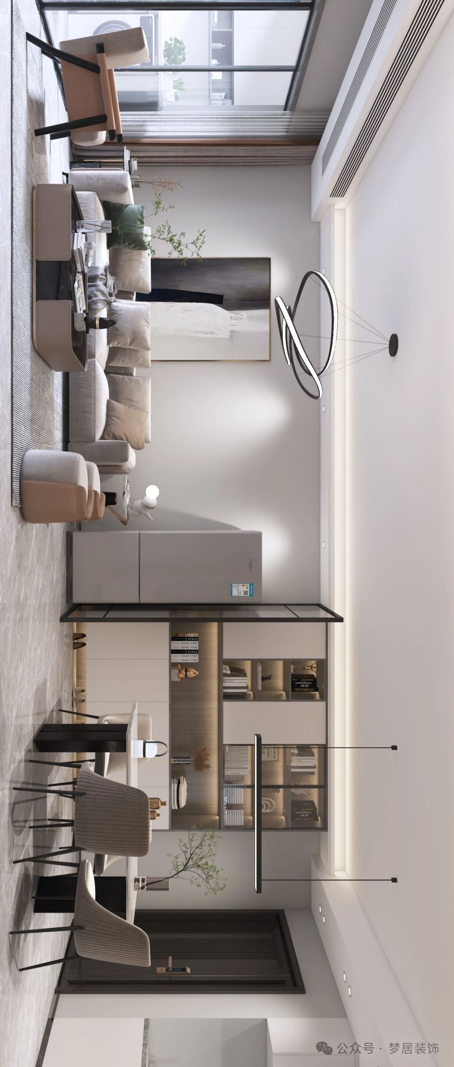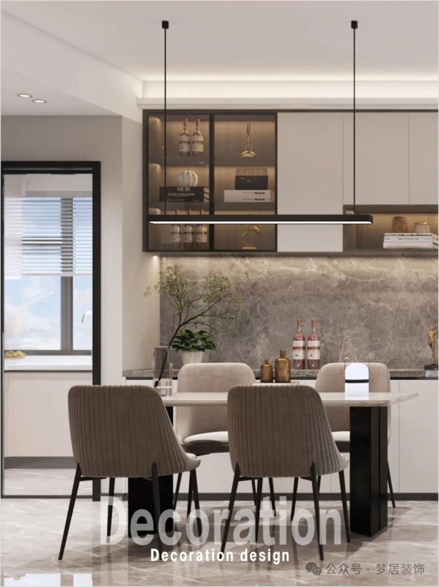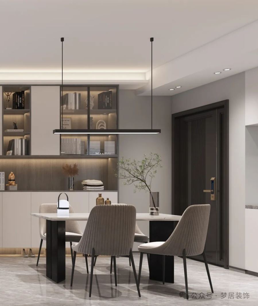 餐廳區(qū)域選擇了長方形餐桌,一字簡約吊燈和讓空間更具時尚感。白色的巖板餐桌搭配灰色餐椅,使得用餐氛圍簡潔時尚而精致有儀式感。