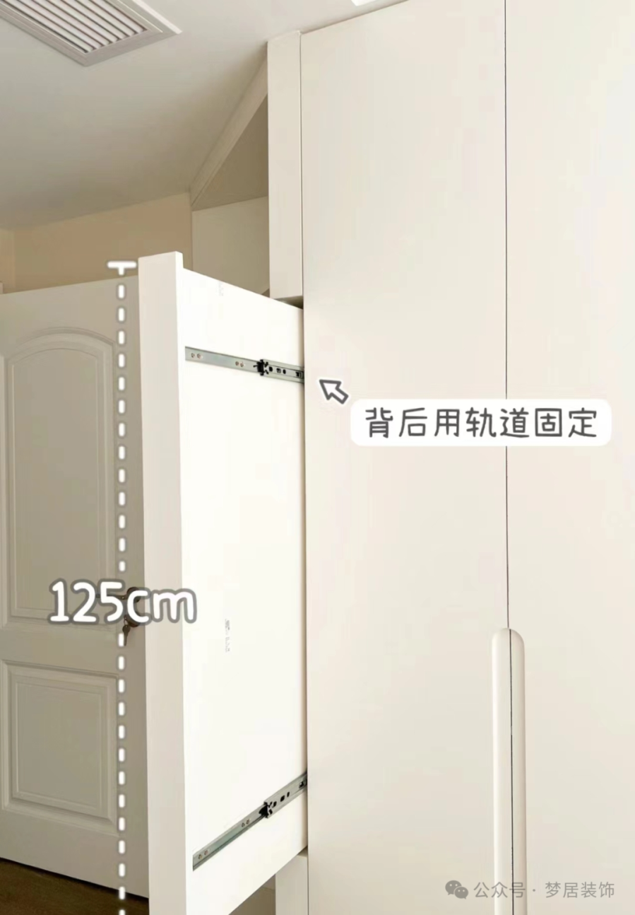 ②定制衣柜的時候在合適的位置預留出10厘米空間,做一個可推拉的格子,將鏡子安裝到這里,用的時候拉出來,不用時收起來,一點兒不占地方。