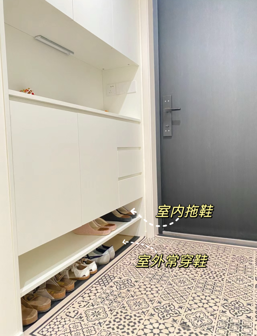 但其實底部兩層開放格更實用,一層用來收納室內(nèi)鞋,一層收納室外常穿的鞋子,即使有客人來了,也有地方放置,不會亂糟糟的。