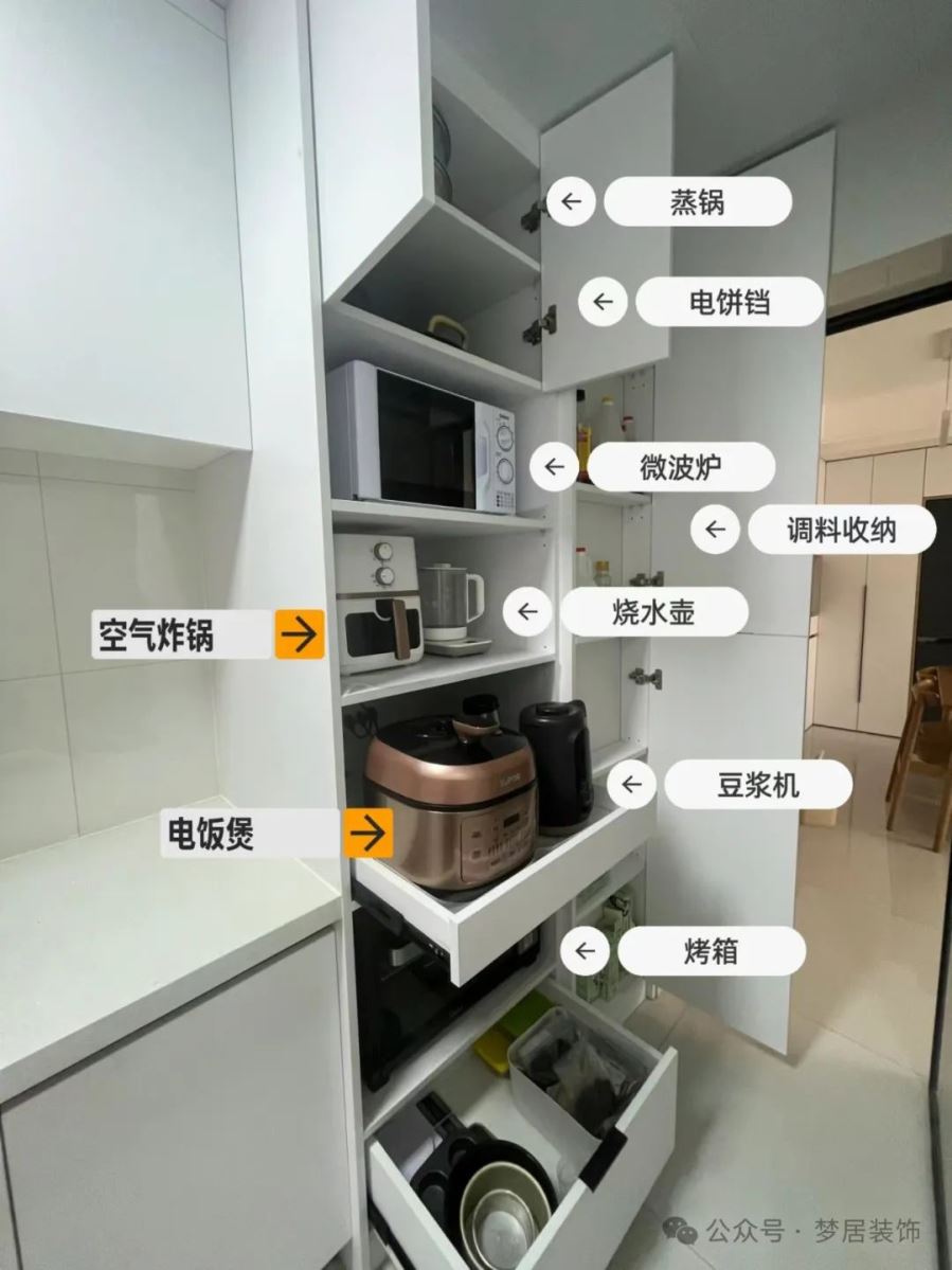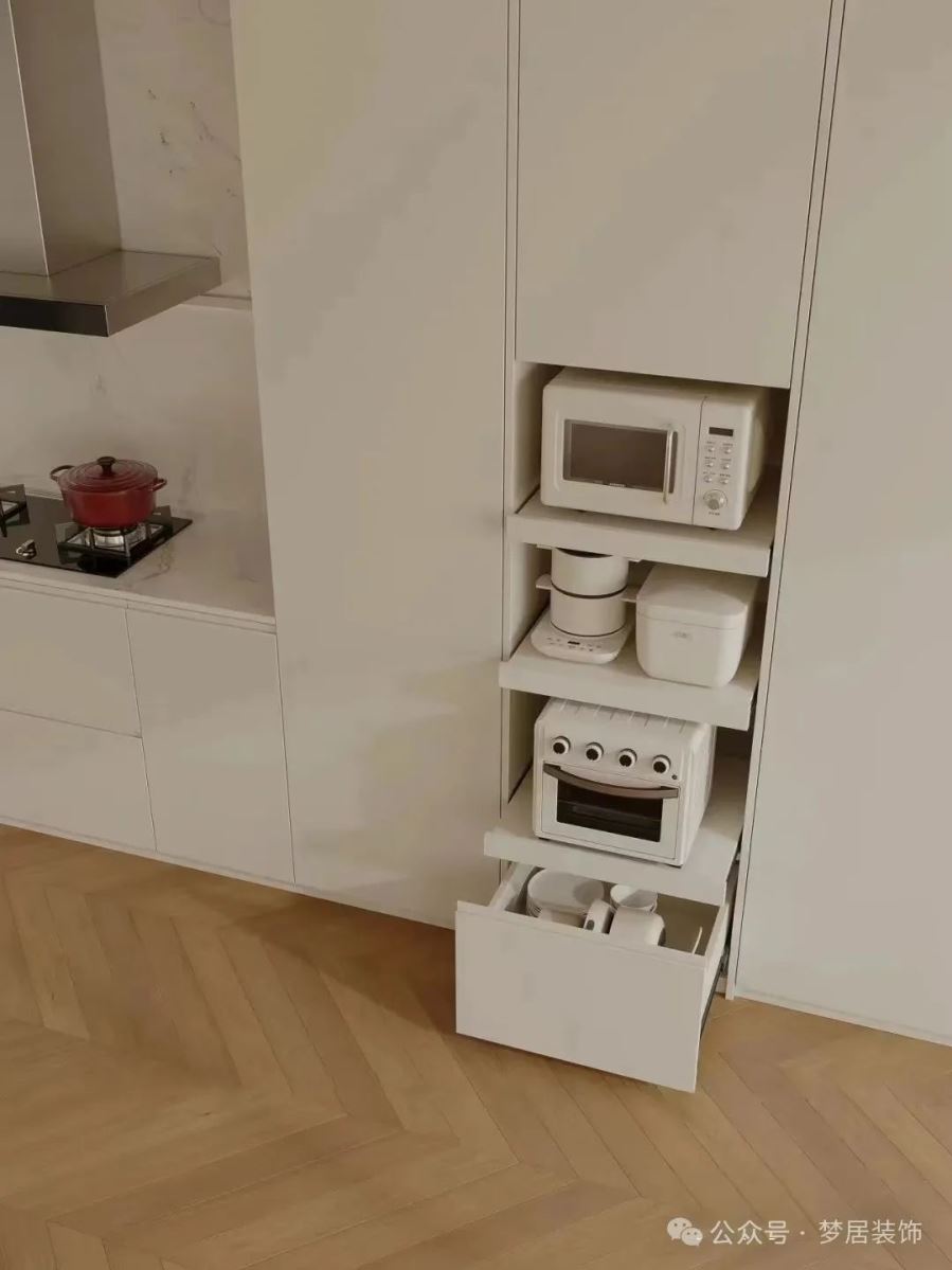 一般人家的廚房,小電器總是堆在一塊使用時才拿出來,烹飪好后再放回去,使用過程非常麻煩。不如直接做一個專門的小家電收納高柜。