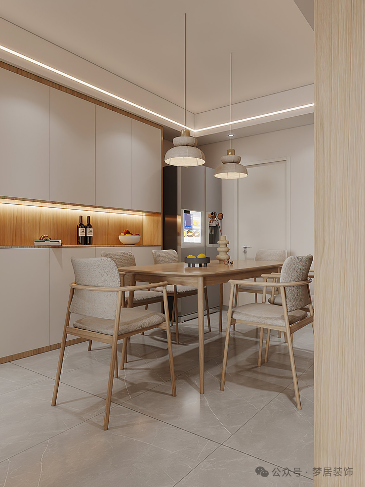 考慮到空間整體性和日常生活的舒適性,將原本放置冰箱的墻面內(nèi)移,冰箱完美嵌入,上方增加一組壁柜增加收納空間??筒蛷d做了邊吊設(shè)計,搭配線形燈,氛圍感充足,延展視覺空間。原木長桌搭配布藝餐椅,給予視覺上的舒適自然感。