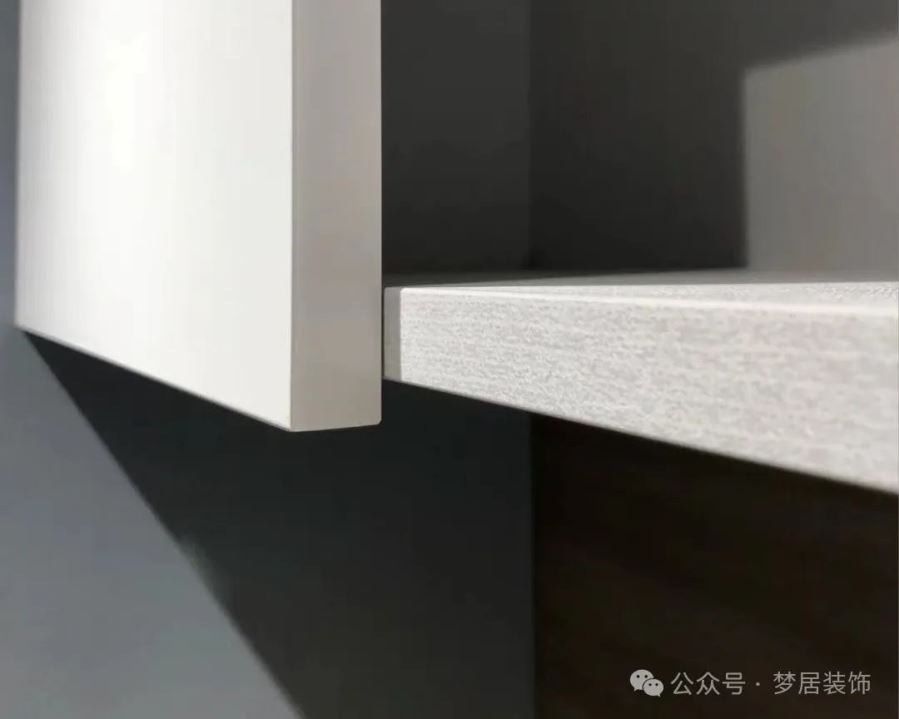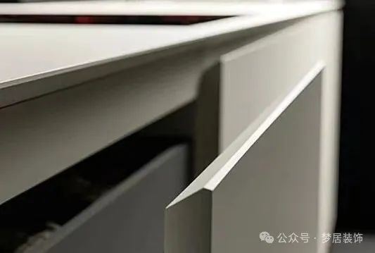 首先無拉手的設(shè)計,不會藏污納垢,也避免來回行走磕碰。吊柜可以把門板向下延伸1-2cm,地柜則可以做成45°斜切角,直接把柜門往外一拉就打開了。