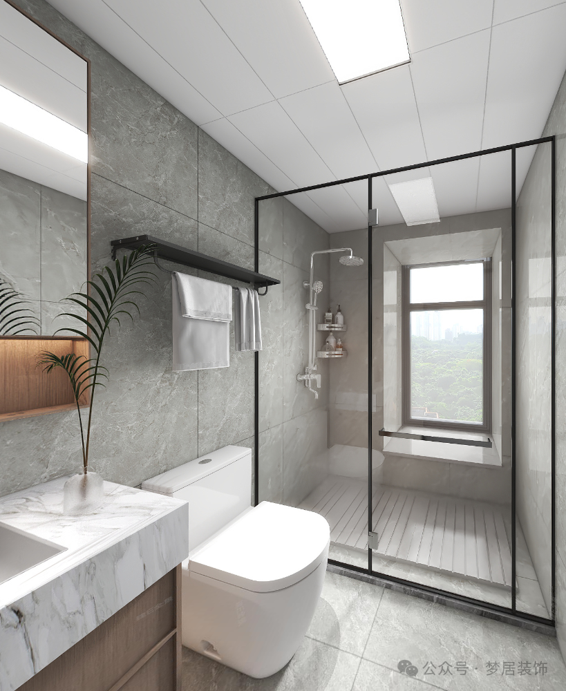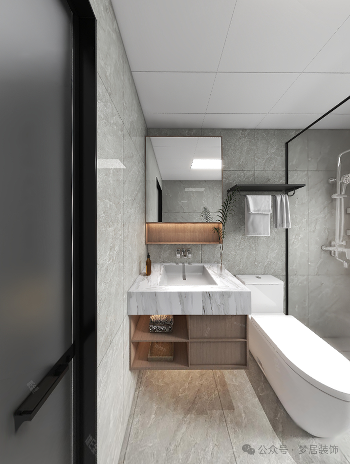 衛(wèi)浴空間用經(jīng)典的灰白黑增添了空間的跳躍感,搭配極窄邊框的淋浴隔斷讓空間顯得精致優(yōu)雅。營(yíng)造出舒緩、雅致、自在的空間氛圍,空間通透明亮。