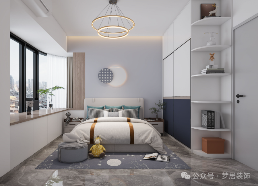 男孩房的設(shè)計(jì)相對(duì)自由、個(gè)性的同時(shí),又能讓人安靜享受著生活?;顫姼蓛舻姆諊斡易杂伞R鹿窳舫鲆回Q排實(shí)用的陳列展示格,用來(lái)展示與收納孩子喜歡的小物件,空間的趣味互動(dòng)極大增強(qiáng)。