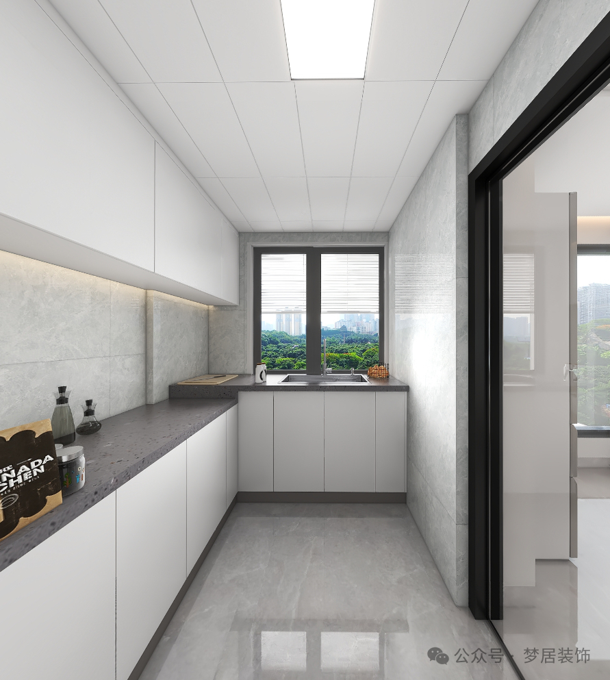 廚房搭配黑框玻璃推拉門,光線通透,餐廳與客廳實(shí)現(xiàn)了更多互動(dòng)的可能。白色柜體與墻面讓廚房更通透。整體結(jié)構(gòu)簡(jiǎn)單明了,簡(jiǎn)約的風(fēng)格讓人心情愉悅。