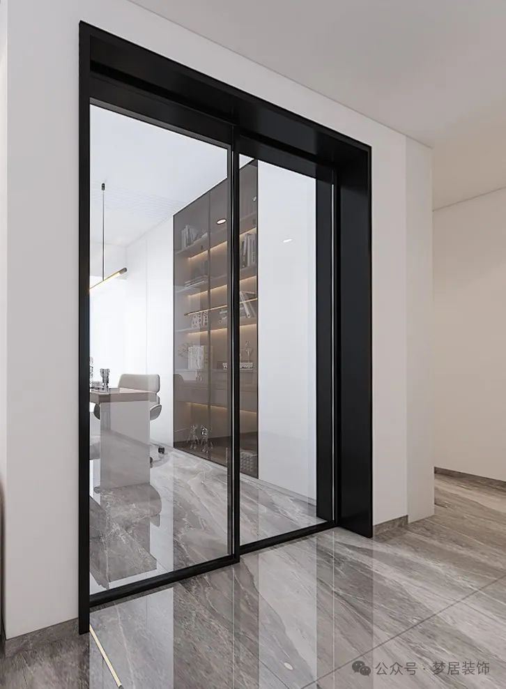 書房設(shè)置了一整面的柜子,1/3的透明展示柜搭配茶色玻璃和燈帶讓極簡(jiǎn)的空間透出高級(jí)的質(zhì)感,解決實(shí)用功能的同時(shí)又增加了空間的品味。